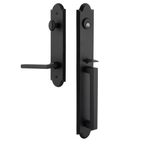 Inspired by ancient architectural forms, the Dome One-Piece Handleset features gracefully arched top and bottom contours that evoke a sense of enduring elegance. The substantial D-Grip provides a comfortable hold and timeless appeal, making it a distinguished choice for stately entryways. The powder coated matte black finish provides superior resistance to the elements, making it ideal for use in any environment. Each Ageless Iron product has been tested extensively in Florida exposure for UV resistance and anti-corrosion.