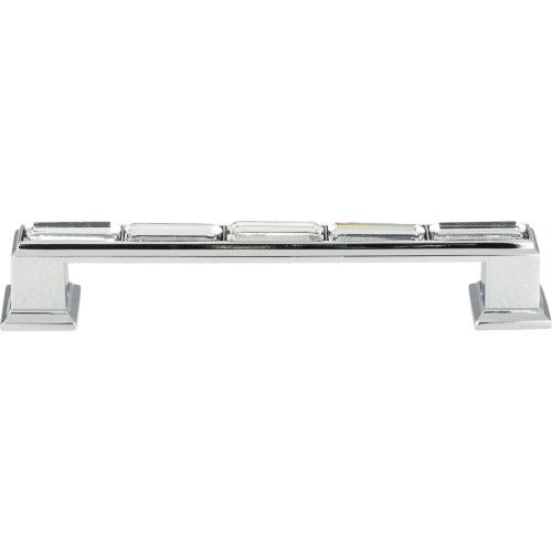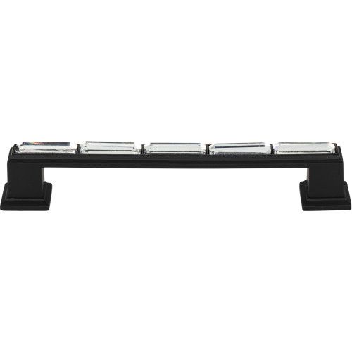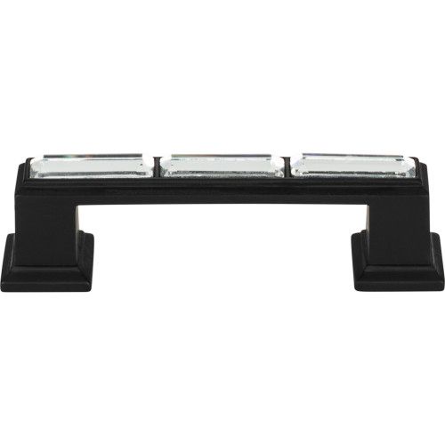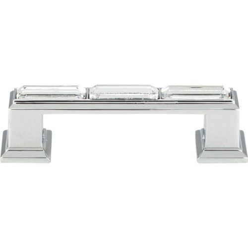 Atlas Homewares Legacy Crystal Cabinet Pull features three rectangular crystals on the handle of a bar-style pull with wide block feet. Choice of 3-inch and 5 1/16-inch lengths and three finishes. Zinc Alloy.