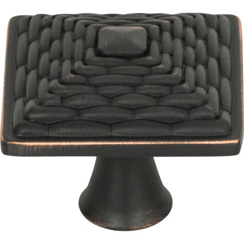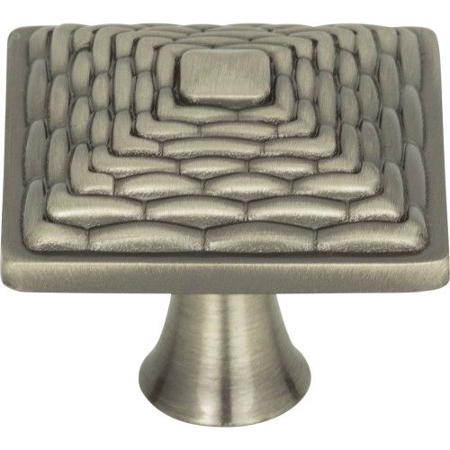 Atlas Homewares Mandalay Square Knob features a low pyramid profile with textured design. Made of a durable Zinc Alloy in choice of Champagne, Venetian Bronze, and Brushed Nickel. 1 1/4-inches long.