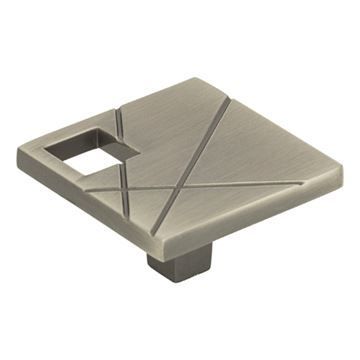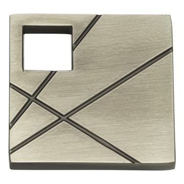 Atlas Homewares Square Knob features a squared top with cutout in one corner and criss-cross engraved lines. The modern knob is made of Zinc and offered in Matte Black, Polished Chrome, and Brushed Nickel in right and left hand orienation.