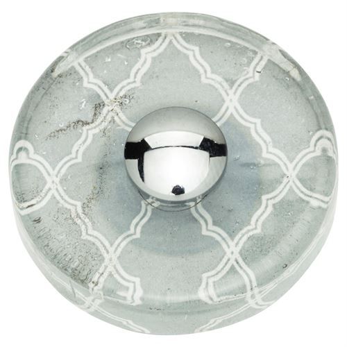 Atlas Homewares Quatrefoil Glass Round Knob showcases a glass, donut-shaped top with quatefoil design. A quarefoil is symbol of good luck and consists ofa symetrical shsape formed by the outline of four partially overlapping circles of the same diameter. The round Brass base is finished in Polished Chrome. 1-1/2-inch diamter.
