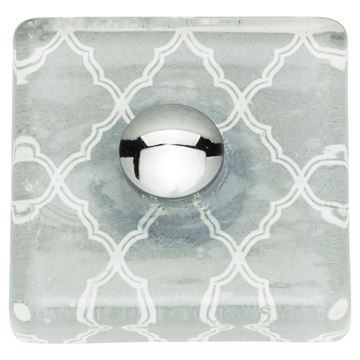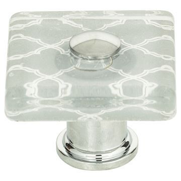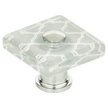 Atlas Homewares Quatrefoil Glass Square Knob showcases a glass, donut-shaped top with quatefoil design. Polished Chrome Brass base. 1 1/2-in. long.