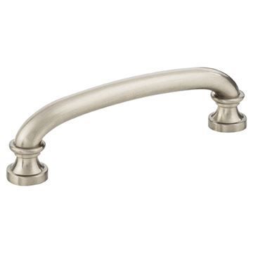 Atlas Homewares Shelley Pull features a round, arched bar handle and cone-shaped feet with decorative ring accents. This elegant pull is available in six finishes. 3-3/4 inch boring. Zinc Alloy.