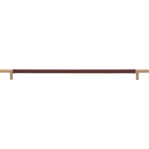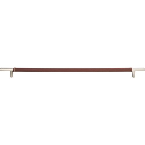 Atlas Homewares Zanzibar Brown Appliance Pull features a classic round bar design wrapped in faux brown leather for a masculine, modern look. Made of Zinc in choice of Polished Chrome or Warm Brass. 17-inch boring.
