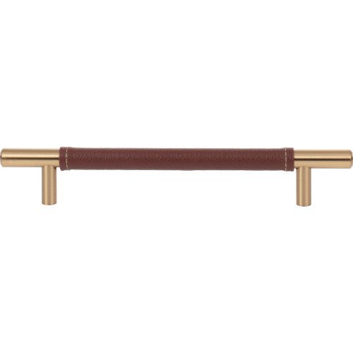 Atlas Homewares Zanzibar Brown Leather Cabinet Pull features a classic round bar design wrapped in faux brown leather for a masculine, modern look. Available in three lengths and three finishes. Zinc Alloy.