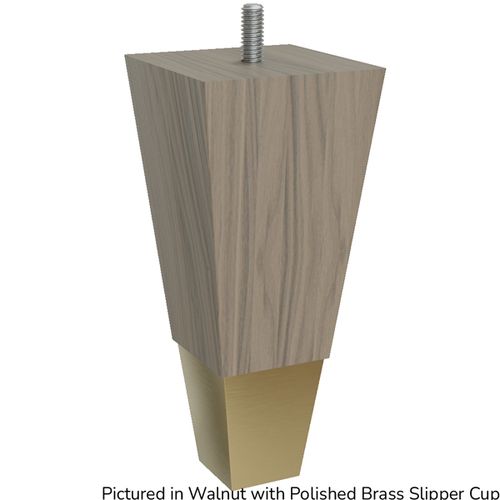 Modern trends have utilized mixed materials more and more often. These new tapered feet with brass slipper cups can give you that style on your favorite furniture or fixture. The feet are made in the USA with real North American hardwoods; the slipper cups are made from real brass and given a premium finish. They're available in three wood species and four finish options. They're easy to assemble with included hardware and even easier to install with a pre-attached hanger bolt at the top. Felt pads are not included.