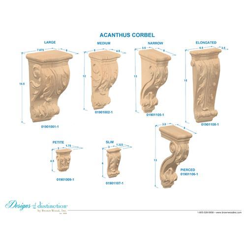 These Designs of Distinction Hand Carved 4 1/2 Inch Acanthus Corbels add elegant detailing to your Mediterranean and Tuscan decor. Establish a theme using other wood components from the Acanthus Collection. The small corbel is used mainly for decorative applications under cabinets, shelves, counters, and more. Cherry and Hard Maple.