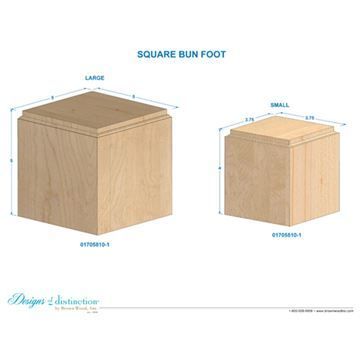 This 5-inch Designs Of Distinction Large Square Bun Foot has a square profile for a classic appeal. Use on chairs, sofas, ottomans, china cabinets, and other furniture for a fresh, new look. Available in several wood species and ships unfinished ready to stain.
