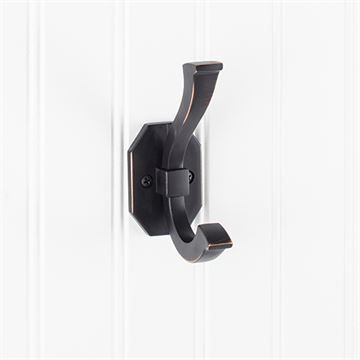 Elements Classic Double Wall Mount Coat Hook is a bold design with octagonal backplate and squared double hook in an upper and lower hook arrangement. Polished Chrome, Satin Nickel, and Brushed Oil Rubbed Bronze finishes. 4 5/16" tall with projection of 2 3/4".