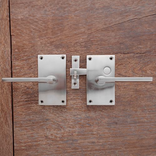 A solid polished stainless bronze case latch set which is designed for outdoor gates and doors and is operable from both side of the gate or door. This product has an active bar side and a dummy side which connects through the gate with an included spindle. Levers are attached to the plate. Includes both surface and mortise strikes. Choose your size based on 1 1/2" gate thickness to 5" gate thickness. The included gate stop must be installed with the product or the gate or door must have a built in stop otherwise the warranty is void.