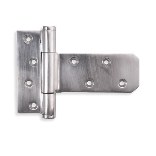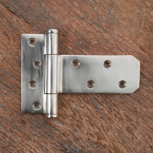 A solid polished stainless bronze t-hinge for gates and doors. Weight load is 70 lbs for a pair, and 125 lbs for three. These are hand made and hand cast, they may vary slightly in uniformity and thickness.