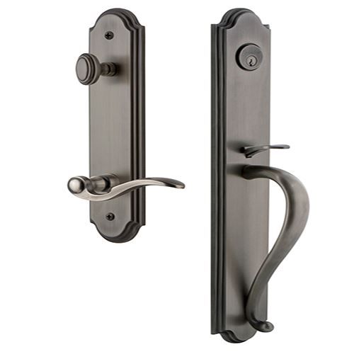 Stacked beveled edges and graceful curves provide a stately presence in the Grandeur Arc Handleset S Grip and Bellagio Lever - Keyed Alike. The Arc One-Piece Handleset is available with any Grandeur Hardware knob and lever. Offered in Vintage Brass, Antique Pewter, Satin Nickel, Timeless Bronze and Lifetime Brass.