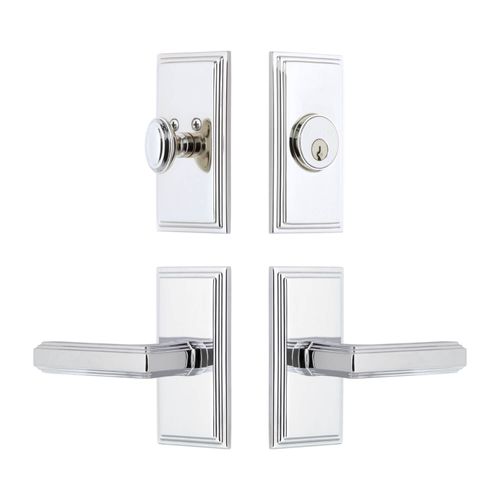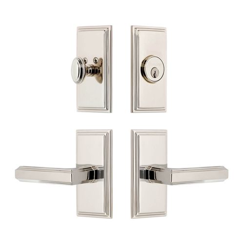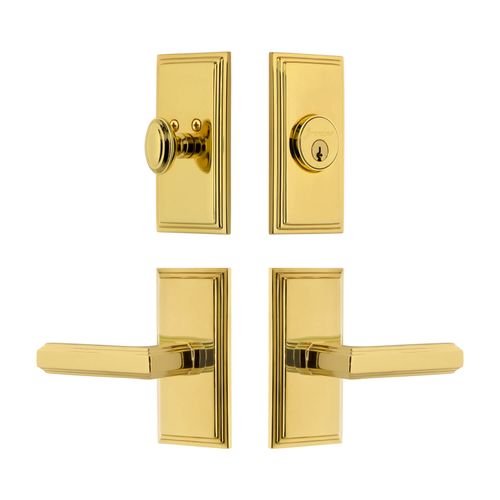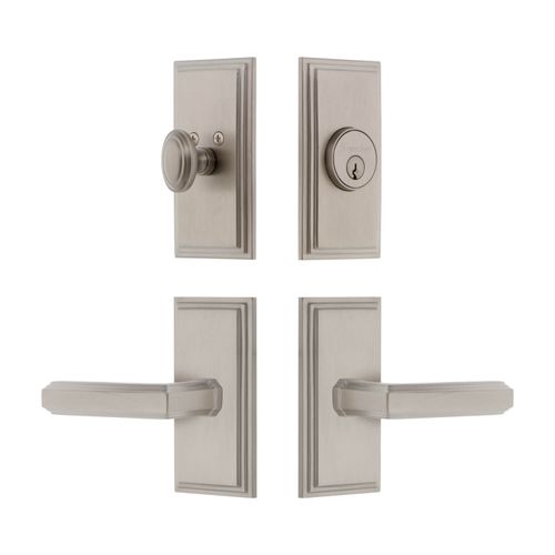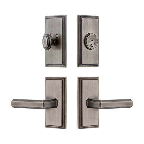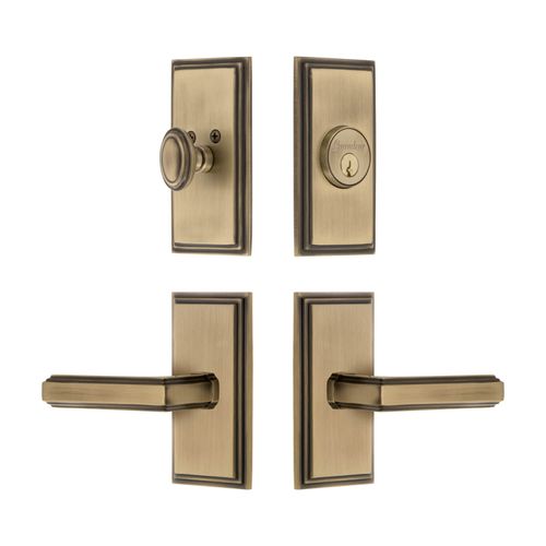 Bring refined elegance to any door with the Grandeur Carre Concealed Screw Entry Set showcasing beveled edges and the stylish Carre Lever. The Carre plate, with its clean parallel lines and uncomplicated shape, provides endless versatility. The addition of the Carre Lever, with its architectural stepped edges, creates a stately combination. Pair with a matching deadbolt for added security. All Grandeur products are created from solid (not plated) forged brass. Choose from Antique Pewter, Bright Chrome, Lifetime Brass, Polished Nickel, Satin Brass, Satin Nickel, Timeless Bronze, or Vintage Brass finishes. Available in 2 3/8" or 2 3/4" backsets with left- or right-hand levers.