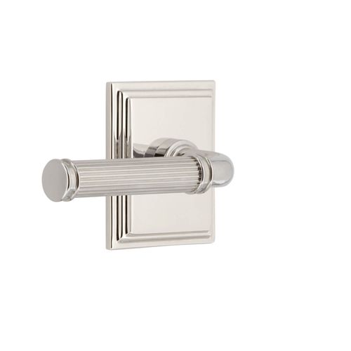The ribbed Soleil Lever on the Grandeur Carre Square Concealed Screw Privacy Set - Soleil Lever is reminiscent of classic Greek and Roman columns. Mounted on a square stepped edge backplate for a classic look. This is a Privacy set. Choose from Antique Pewter, Bright Chrome, Lifetime Brass, Polished Nickel, Satin Brass, Satin Nickel, Timeless Bronze, or Vintage Brass finishes. Available in 2 3/8" or 2 3/4" backsets with left- or right-hand levers.