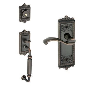 Grandeur Windsor Fluted Grip Thumblatch To Portofino Lever Entry Set was inspired by P & F Corbin's "Manua" pattern of 1905. The back plates are exquisitely detailed with neo-classical motifs. The Portofino lever with it finely detailed back plate adds a distinguished and captivating look. The other side features a fluted grip handle with thumb latch. Available in five distinctive finishes. Choose right or left-handed handling.