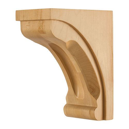 The Legacy Heritage 8 Inch Modern Scooped Corbel features a curved front with two hollowed out sections for a modern, stylish look. Use this solid wood corbel under cabinets, countertops, mantels and more. Available in Alder, Maple, Cherry, or Rubberwood.