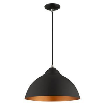 A black finish defines the striking look of this Livex Lighting 15 1/2 Inch Dome Metal Shade Mini Pendant. It has a single-light construction, with a gold finish on the underside for a lovely contrast. Industrial chic has never looked better.
