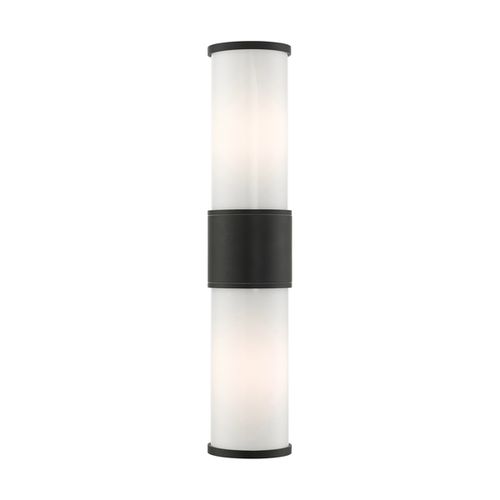 Add a dash of character and radiance to the exterior of your home with this wall lantern. This two-light large fixture from the Norfolk Collection features two satin opal white glass cylinder closed top shades on either side, set off with a Textured Black finish. The clean lines of the back plate complement the cylindrical glass shades adorned with detailed trim at the end of each glass creating a minimal, sleek look that works well in most outdoor or indoor settings. This fixture adds charm and contemporary aesthetics to your home.