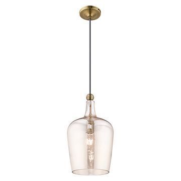 Livex Lighting 41226 Art Glass Pendant Light showcases a graceful carafe-shaped champagne glass mini pendant and black cord. This stunning pendant will add a simple look to any kitchen, bar, or hallway. Choose from Antique Brass or English Bronze finishes.