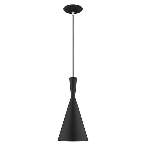 This modern double-cone shade on the Livex Lighting 7 1/4 Inch Retro Metal Shade Mini Pendant is adaptable to a full range of decor styles. Choose from Black, Brushed Aluminum, or White finishes.