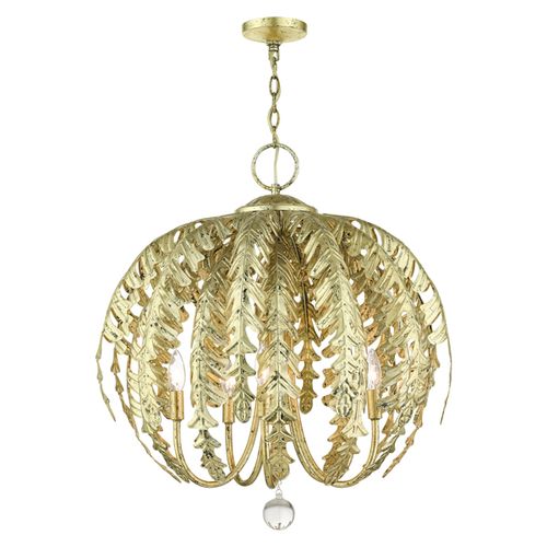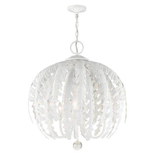 The name for the Acanthus collection is inspired by the simple beauty of the Acanthus leaf. The lights are hidden behind the graceful leaves to create a romantic warm indirect effect. Finished off in a distressed finish, this five-light shabby chic chandelier is embellished with a clear crystal ball. This strong, alluring piece will provide warm glow to your dining room, kitchen, bedroom or living room to create a casual romantic atmosphere. Choose from Antique White or Hand Applied Winter Gold finishes.