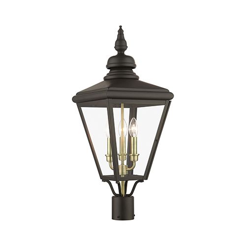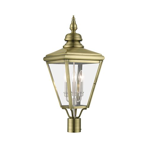 Livex Lighting Adams Outdoor Large Post Top Lantern showcases metal curved arms attach to the solid brass decorative housing. Clear glass shows off the finish. Choice of three finishes. 26 3/4 inches tall.