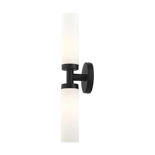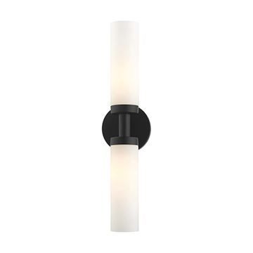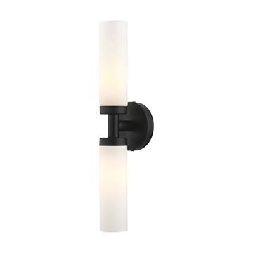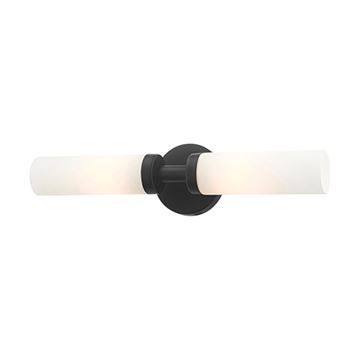 Livex Lighting Aero Single 18 Inch Wall Sconce features a modern finish with two satin glass cylinder shades on either side. The clean lines of the back plate complement the cylindrical glass shades creating a minimal, sleek, urban look that works well in most decors. This vanity sconce adds upscale charm and contemporary aesthetics to your home. Choose from Black or Satin Brass finishes.