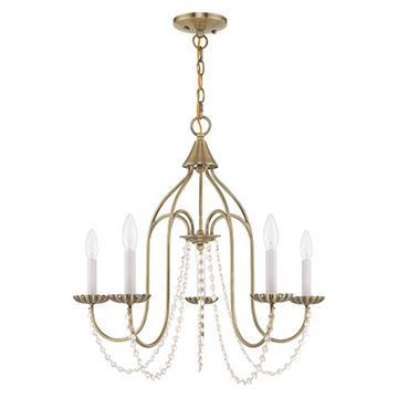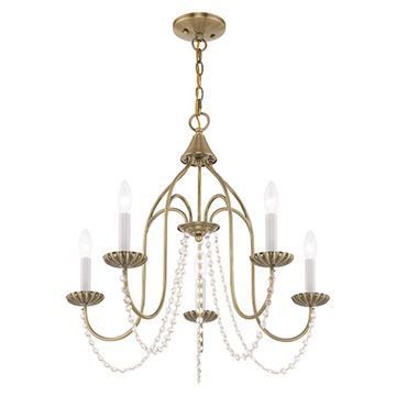 The simplicity of this five arm Livex Lighting Alessia Chandelier is gently draped with clear crystal trim, making this an ideal fixture for many different decor settings. Choose from Antique Brass, Antique White, Black, Brushed Nickel, or English Bronze finishes.