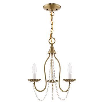 Livex Lighting Alessia Mini Chandelier features three arms gently draped with clear crystal trim making this an ideal fixture for many different decor settings. Choose from Antique Brass, Antique White, Black, Brushed Nickel, or English Bronze finishes.