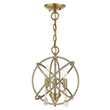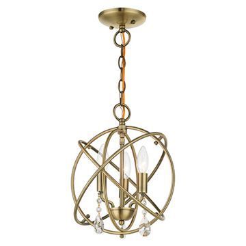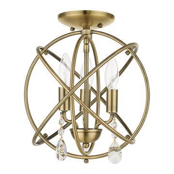 The three-arm light cluster nestled within orbiting rings of this Livex Lighting Aria Convertible Chandelier/Semi Flush Light features faceted clear teardrop crystals. Use multiples of these fixtures over your kitchen island or convert this to a semi flush mount for your hallway or bathroom. With its easy installation and low upkeep requirements, this light will not disappoint. Available in Antique Brass, Black, or Bronze finishes.