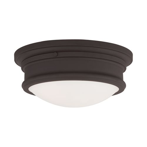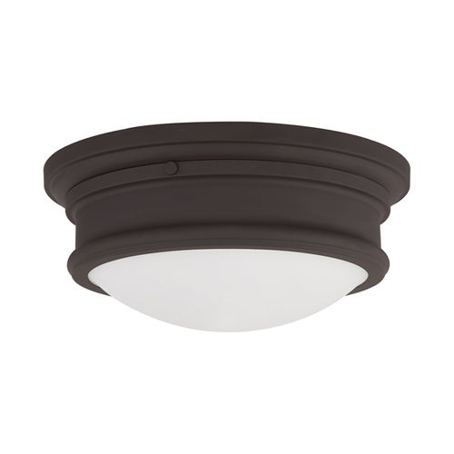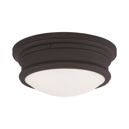 Paired with hand blown satin opal white glass, this sleek flush mount will complement your transitional decor with its clean, stylish look. Choose from Antique Brass, Bronze, or Brushed Nickel finishes.