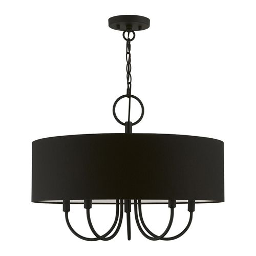 The five-light Bainbridge pendant chandelier is both modern and versatile. The hand-crafted Black fabric hardback drum shade is set off by an inner silky white fabric that combines with chandelier-like Black finish sweeping arms which creates a versatile effect. Perfect fit for the living room, dining room, kitchen and bedroom.