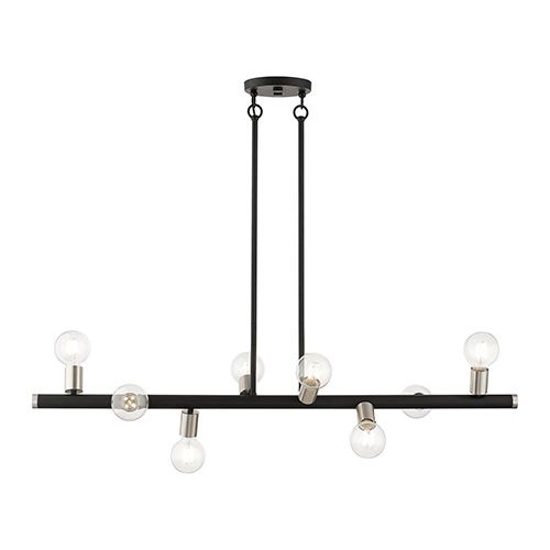 Livex Lighting Bannister Large Linear Chandelier features a wide bar suspended by two bars with 8 exposed bulbs for a modern flair. This eight-light asymmetrical large chandelier design gives a new face to a kitchen or dining room. Black with Brushed Nickel or Brushed Nickel finish.