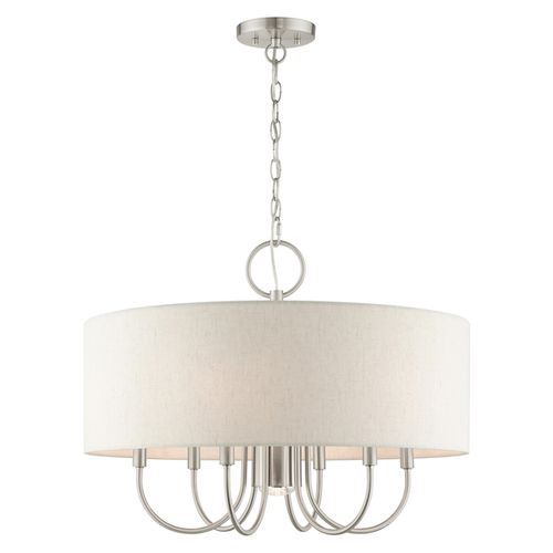Add a touch of stylish sophistication with the Blossom series, a graceful transitional collection. Look no further if you crave to add warmth and richness to any formal or casual interior. The elegant curved arms suspended under the handcrafted hardback oatmeal colored shade will create a timeless feel to the living room, dining room or a bedroom. This meticulously crafted seven light pendant chandelier features a downlight and is available in an Antique Brass, Brushed Nickel, or English Bronze finish.