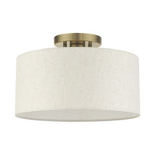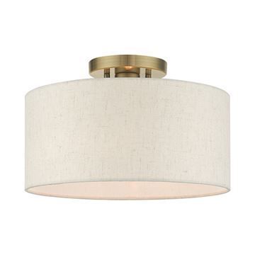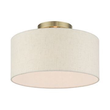 Livex Lighting Blossom Semi Flush Light adds warmth and richness to any formal or casual interior. The elegant handcrafted hardback oatmeal colored shade will create a timeless feel to the hallway, bathroom, kitchen or a bedroom. This meticulously crafted single-light semi flush is shown in an Antique Brass finish.