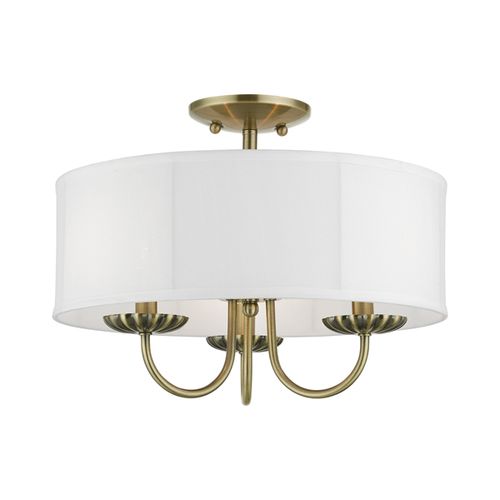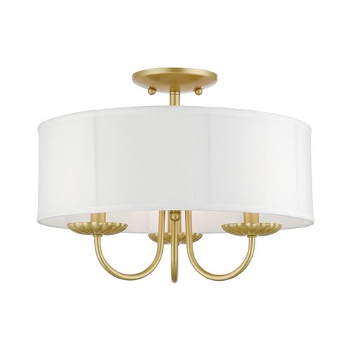 The three-light Brookdale semi-flush combines floral details and casual elements to create an updated look. The hand-crafted off-white fabric hardback drum shade is set off by an inner silky white fabric that combines with chandelier-like sweeping arms which creates a versatile effect. Perfect fit for the living room, dining room, kitchen or bedroom. Choose from Antique Brass, Black, Brushed Nickel, or Soft Gold finishes.