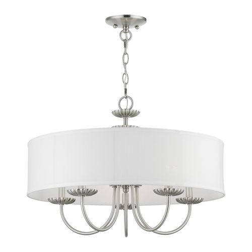 The five-light Brookdale pendant chandelier combines floral details and casual elements to create an updated look. The hand-crafted off-white fabric hardback drum shade is set off by an inner silky white fabric that combines with chandelier-like sweeping arms which creates a versatile effect. Perfect fit for the living room, dining room, kitchen or bedroom. Choose from Antique Brass, Black, Brushed Nickel, or Soft Gold finishes.