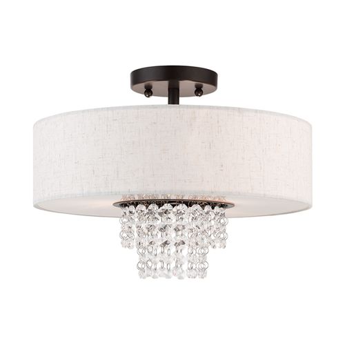 This contemporary style semi flush mount from the Carlisle collection features an English Bronze finish with hanging strands of beautiful clear crystals. The crystal drapes from a hand crafted oatmeal fabric hardback shade and creates a magnificent sophisticated look.