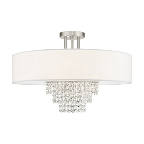 A contemporary style semi flush mount from the Carlisle collection. The design features a Brushed Nickel housing and canopy, with hanging strands of beautiful clear crystal. A hand crafted off white fabric hardback drum shade surrounds the crystals and fixture frame, and creates a magnificently sophisticated look.