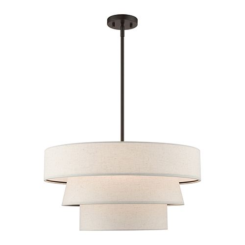 The Livex Lighting Chandler Pendant Chandelier combines modernity and versatility with its hand-crafted oatmeal-colored fabric hardback shade, creating a warm ambiance. The triple drum shade, featuring four lights, adds a touch of character to this stylish pendant. It's a perfect addition to various rooms, including the living room, dining room, kitchen, and bedroom, offering both elegance and functionality in lighting.