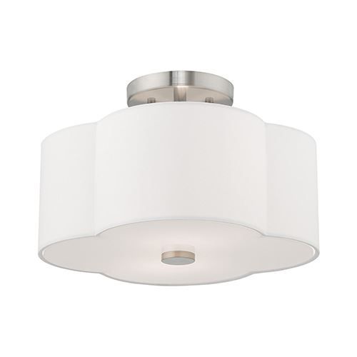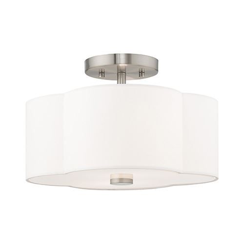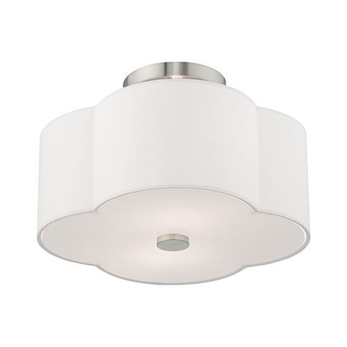 The Livex Lighting Chelsea 13 Inch Ceiling Light features clover-shaped, off-White hardback shade on a Brushed Nickel frame with a white acrylic diffuser to hide the bulbs. It will be the perfect pick for a traditional to contemporary style.