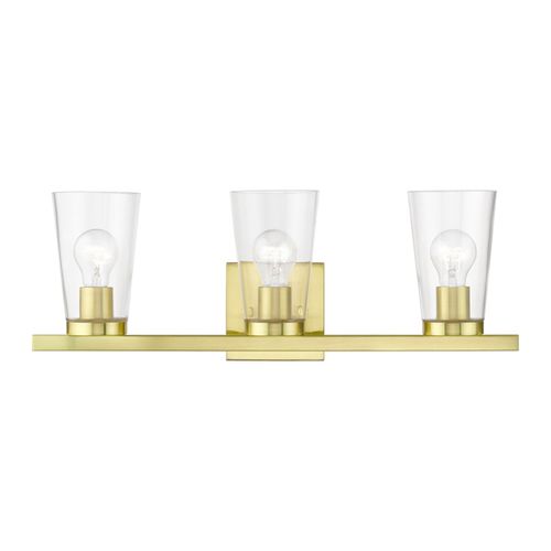 Brighten up your bathroom vanity with the sleek look of the Cityview three light vanity sconce. The tapered clear glass shades and the black finish make a perfect match. Choose from Black, Brushed Nickel, Polished Chrome, or Satin Brass finishes.