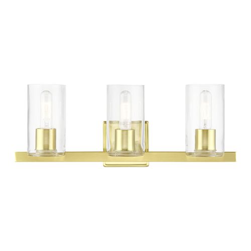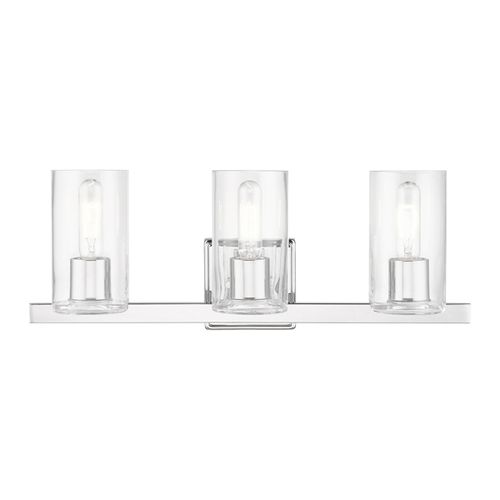The clarion transitional three light vanity sconce will bring posh sophistication to your decor. The backplate and clear cylinder glass give this fixture a sleek, contemporary look. Available in Black Chrome, Brushed Nickel, Polished Chrome, or Satin Brass.