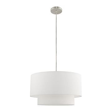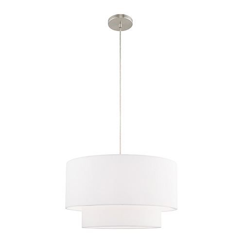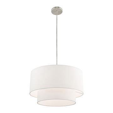Livex Lighting Clark Large Pendant Chandelier features double hardbacked, off-wite drume shades suspended from a rod. The transitional design of this pendant chandelier is as beautiful as it is simple. A Brushed Nickel finish.