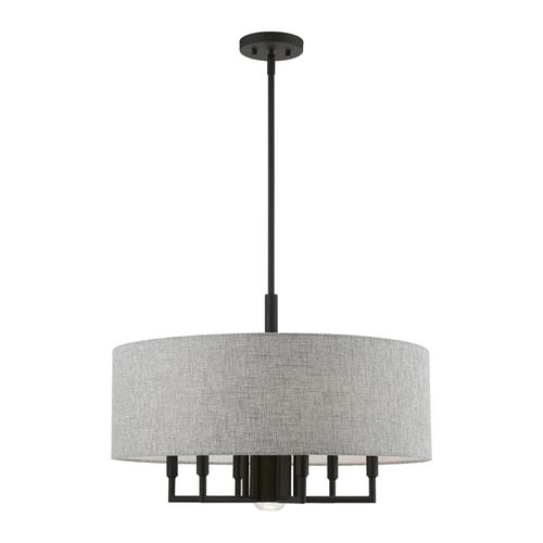 This seven light pendant chandelier from the Dakota collection has a clean, crisp look and contemporary appeal while offering antiquate light with the six up lights and the one down light. The sleek design and angular arm feature a Black or Brushed Nickel finish. The hand crafted urban gray fabric hardback shade with white color fabric on the inside offers warm light for your surroundings.