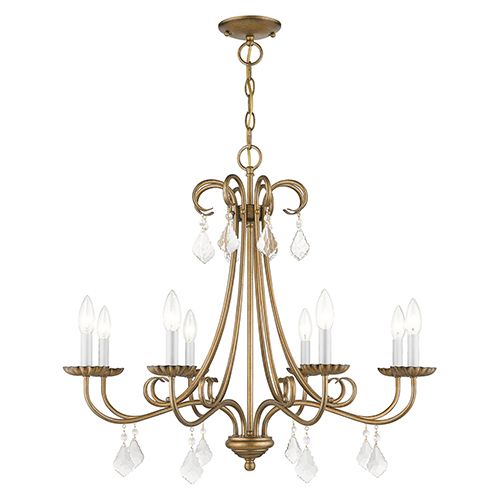 The Livex Lighting Daphne Chandelier combines teardrop crystals and a two-tiered curved steel structure, resulting in a traditional and refined design. Its clear crystal shades make it suitable for various room decors, including Traditional, Colonial, Transitional, and Updated styles. This impressive chandelier can accommodate up to 8 candelabra base bulbs, each with a maximum wattage of 60. It comes with a 3-foot chain and 10-foot wire for versatile installation, and the 5-inch diameter, 1-inch height canopy provides a stylish finishing touch. Enhance your space with this exquisite chandelier, effortlessly marrying timeless elegance with contemporary allure.