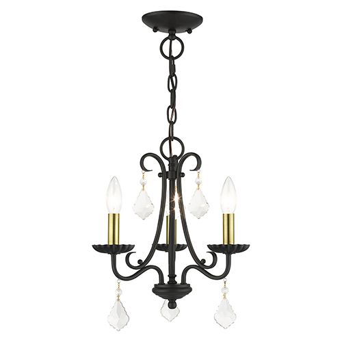 The Livex Lighting Daphne Mini Chandelier combines teardrop crystals with traditional styling, adding a touch of beauty and sophistication. Its subtle sparkle complements various room decors, while the steel construction in a Black with Antique Brass finish adds durability and elegance. Featuring clear crystal shades, this mini chandelier accommodates three candelabra base bulbs (max 60 watts each). It includes a 3-foot chain and 8-foot wire for versatile installation and a 5" diameter, 1" height canopy for a finishing touch. Illuminate your space with this charming mini chandelier that effortlessly blends classic beauty with contemporary elegance.