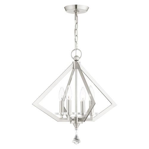 The Diamond four light chandelier lets you explore a new facet of your design sense. Shaped like a diamond, this contemporary four light chandelier is like jewelry for your home's interior. Choose from Antique Brass, Brushed Nickel, Polished Brass, or Polished Nickel finishes.