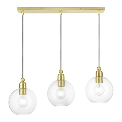 Bring a refined lighting style to your interior with this downtown collection three light linear chandelier with clear sphere glass. Choose from Black or Satin Brass finishes.