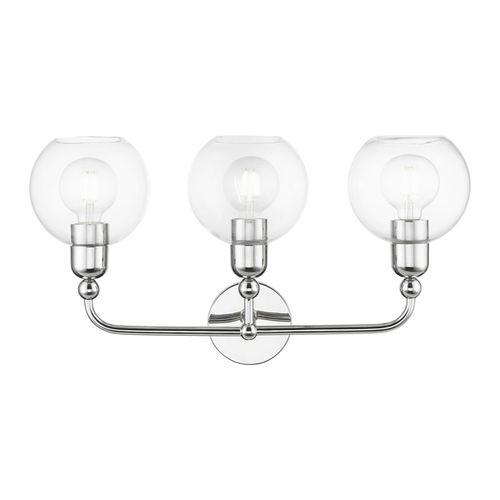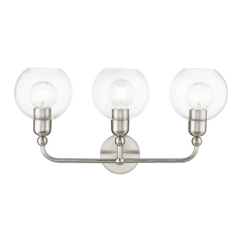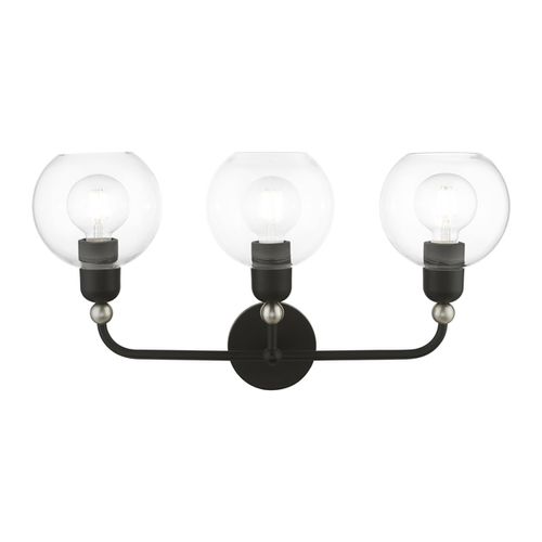 Bring a refined lighting style to your bath area with this downtown collection three light vanity sconce with clear sphere glass. Choose from Black, Brushed Nickel, or Polished Chrome finishes.